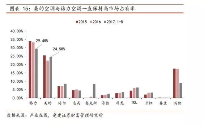 结合上面的数据可以看出,格力领先的市场份额使得其毛利也领先于美的以及海尔,美的虽然市场份额领先海尔,但是毛利反而被海尔超越,主要由于海尔在智能空调细分领域占比达到34.8%,因此空调行业的情况是格力市场领导者,海尔在空调细分市场有一定优势,所以未来空调市场的格局大概会维持现有形式。