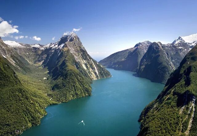 米尔福德峡湾是新西兰峡湾国家公园最大最著名的峡湾,河流向内陆延伸22千米,峡湾水面与山崖垂直相交,冰川被切割成V字形断面。峡谷下沉后就形成了如今的景观。这里峭壁万仞,飞瀑流泉,冰川滢滢,景色美轮美奂,英国作家吉普林称其为“世界第八大奇观”。