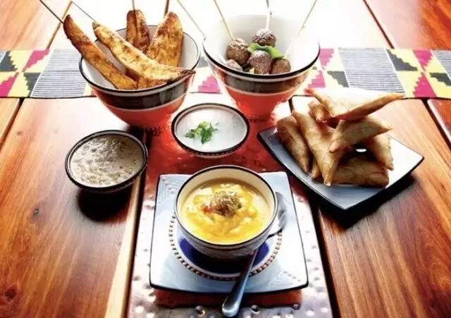 黄金餐厅里除了能吃到非洲各国美食外,还有各种非洲元素和现场表演带给顾客惊喜。在用餐,食客将首先体验三十分钟的学敲非洲鼓仪式,之后领品尝十四道非洲特色菜非洲不同地方的特色美食。