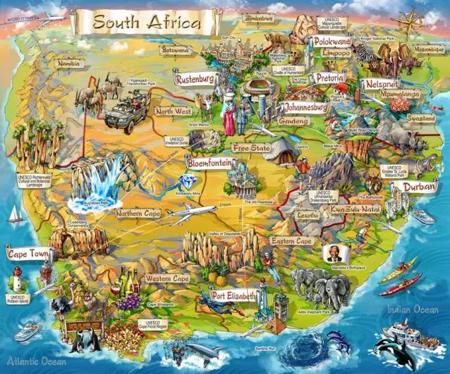 南非位于非洲大陆最南部,三面环海。作为世界上唯一有3个首都的国家,着实会让新鲜的年轻人懵圈。而不同的肤色、11种语言的交错,如同彩虹的各种颜色和谐共存,因此南非被称为“彩虹之国”。