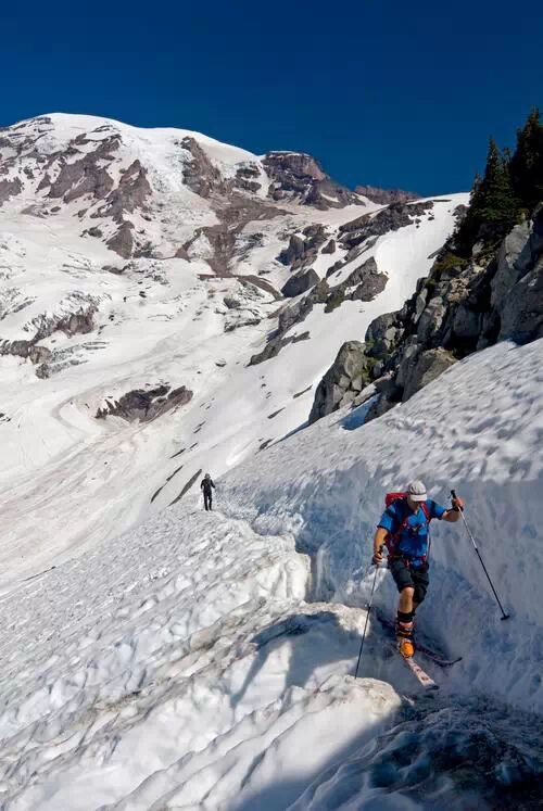 这条线路的终点是位于雷尼尔雪山的缪尔营地。这是此处最受欢迎的营地之一,位于海拔7千英尺(约2130米)处,这也是一般人在不携带登山装备的情况下所能承受的海拔高度。向远处望去,周围皆是皑皑雪山,甚至还可看到西雅图市。