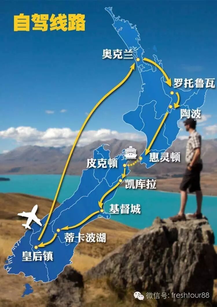 奥克兰→罗托鲁瓦→惠灵顿→皮克顿→凯库拉→基督城→库克山/蒂卡波→瓦纳卡→皇后镇