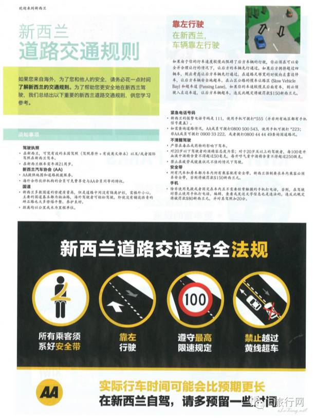 由于新西兰是右舵靠左行驶,与国内相反,因此出发前非常有必要了解和熟悉当地交规。不按规定超车、让车,在陌生的公路/十字路口摸索导航去向等等,可能这些不小心就很容易造成意外,美好的旅程值得让我们提前做好充分的安全驾驶准备不是吗?新西兰的路标设置得还是挺清晰的,当地kiwier虽然开车很快,但该遵守的交规还是严格遵守,在国内如果有随意超车、路口不让车的陋习,到当地切记自觉遵守。