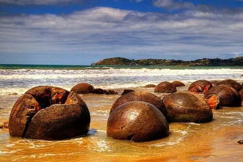 上午沿海岸公路向南,途径莫拉基海滩,海滩上是新西兰最著名的地质奇观莫拉