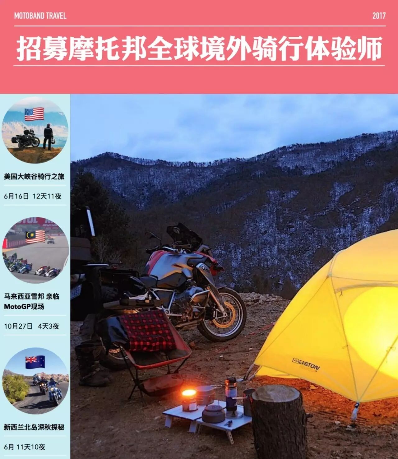 都说四轮承载肉体两轮承载灵魂,但没有摩旅过的骑士之心总感觉缺了点儿什么!我们懂你被生活的琐碎固定在原地的不甘,也知道一个骑士对远方的渴望,每一个骑士都是应该是自由洒脱的。与其每天对着邦里发布的摩旅游记点赞羡慕,不如亲自踏上旅程创造属于自己的独家记忆,生活本身就应该是一场疯狂的旅程。