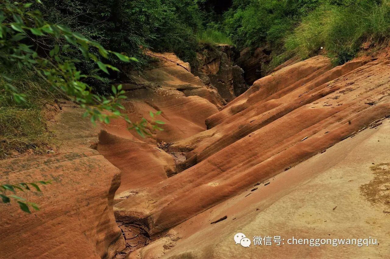 房东临时派给我们一只名叫“毛豆”的白色小狗,欢蹦乱跳,自从我们到来后围着一直要吃要喝;此时它给我们带路,跑前跑后,我们一边逗着它,一边拍片子,不知前面有多少路,我们也不管了,一直往前走,弯弯曲曲,峰回路转,大约走了25分钟,“毛豆”说什么不跟我们了,估计它是怕我们带它走。大约又前行了20分钟,两边的岩石逐渐由红色变成土坡了,至此我们返回,中间又拐进另一个岔沟,这里是沟多岔多,中间还时不时的遇到被山洪冲倒的大树挡住去路,我们排除艰险,一帮一的搀扶拉拽越过障碍,继续向前,早晨2小时只当是锻炼,还饱览祖国的大好河山。