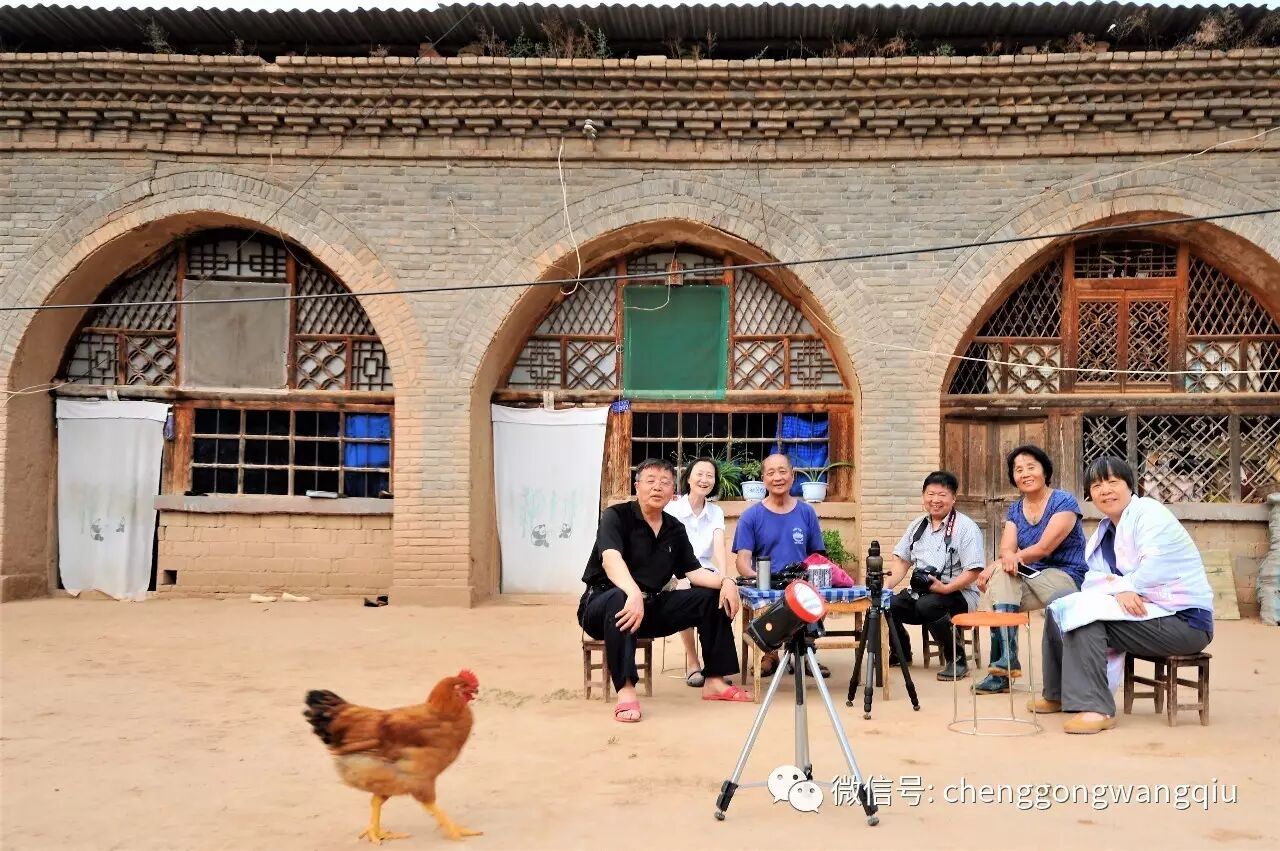 窑洞前合影,大公鸡在配合