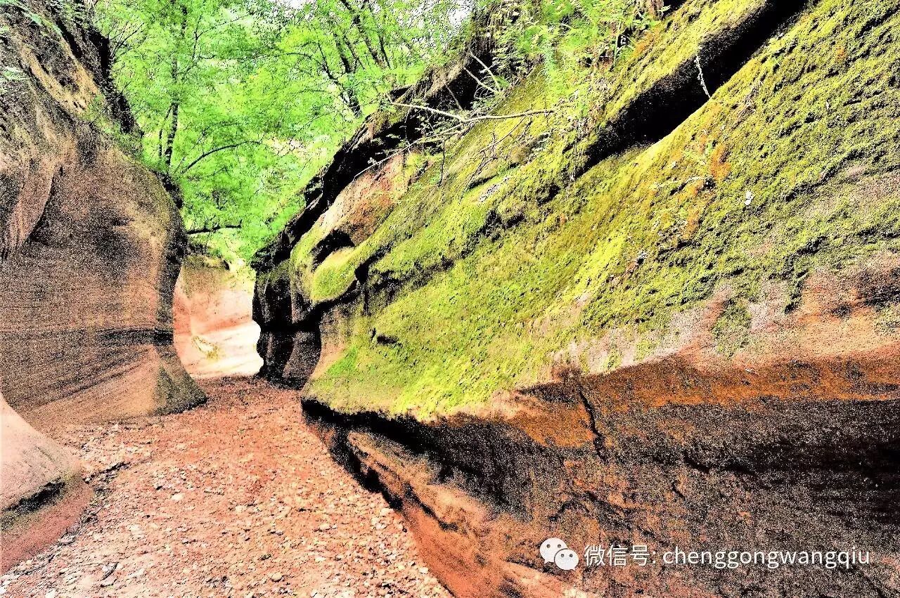 由于习惯早起活动,第二天早上我们一行约十几人,步行沿桦树沟的北侧,一直向沟的深处走去,这里不用穿雨鞋,道路是大小不均的鹅卵石或泥土沙地,像是一条被亿年冲刷的河床,两壁时而陡峭、时而千奇百怪,山石与古树在这里表现出时而张牙舞爪,时而俏皮活波。两侧的绿色植被也是各显神通,长出各种五花八门的枝叶树干斑驳陆离,配合丹霞岩石,展现在我们面前光顾淋漓景色美不胜收。