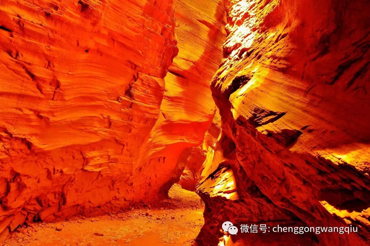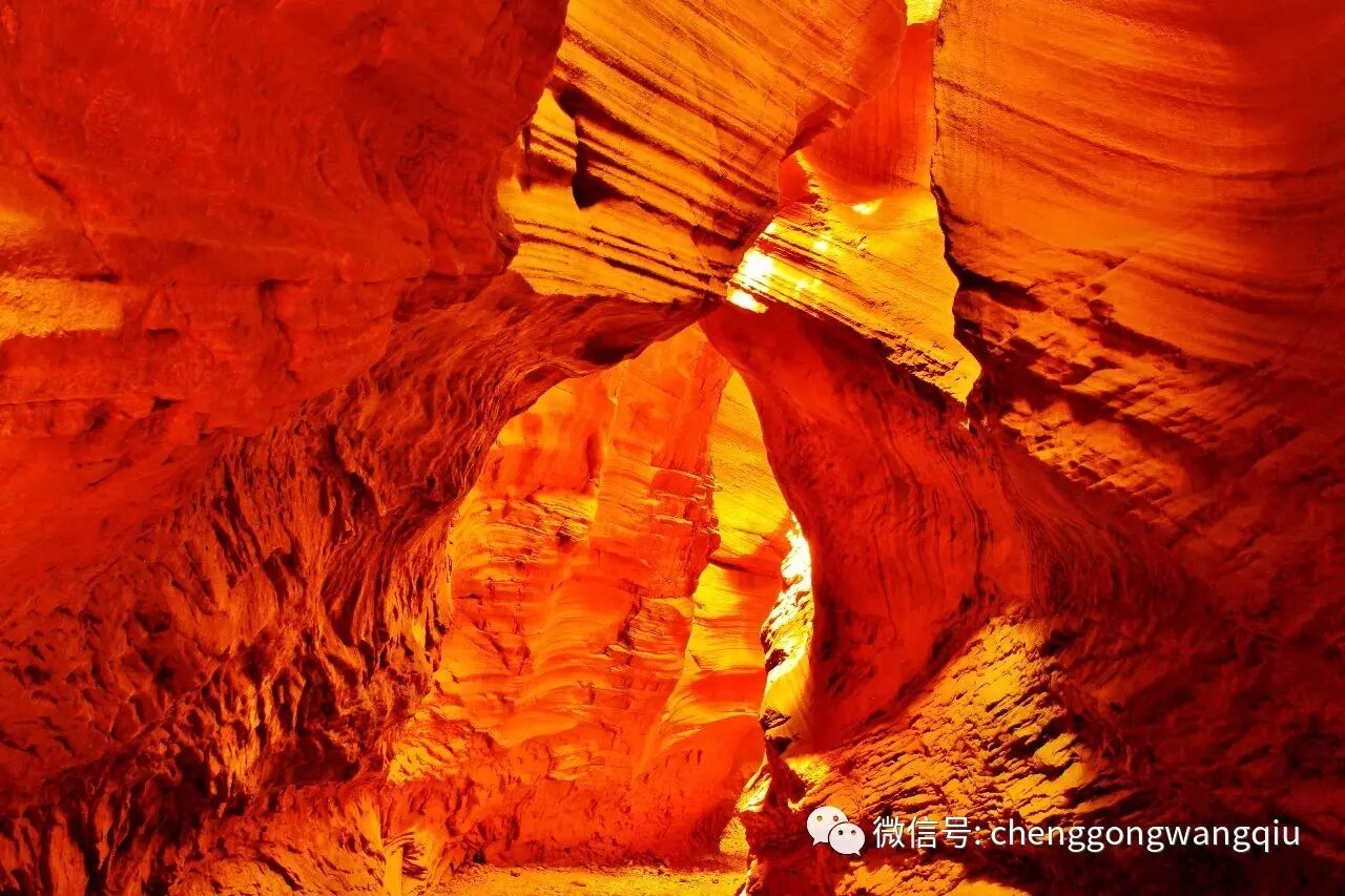 南河沟西沟内有一个“石花洞”,石花洞便是沟的尽头,进入南河沟正是中午时分,阳光穿过洞顶,射进沟里,岩壁照映的红彤彤的,仰望洞顶上方,仿佛一朵“菊花”在头顶上绽放,如梦如幻的光影世界,宛如魔幻的地下天堂。