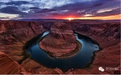 科罗拉多河在这里打出一个完美的U形河道!在悬崖上俯瞰下去,只能看到点点的小小白帆在科罗拉多河中游弋,绝对体验到美国西南部山川河流的雄伟大气! 赤红色的山体映衬着翡翠的河水,在不同的日光中会呈现出赤橙黄绿青蓝紫的颜色,这里是欣赏日落的一个绝佳地点。 马蹄湾所在的佩吉(“Page”)小镇上有很多别具风格的美式餐厅,餐厅里会展出一些当地艺术家的作品。如果你喜欢在旅途中收集独一无二的艺术品留念,不妨在这个小镇边觅食边逛哦。